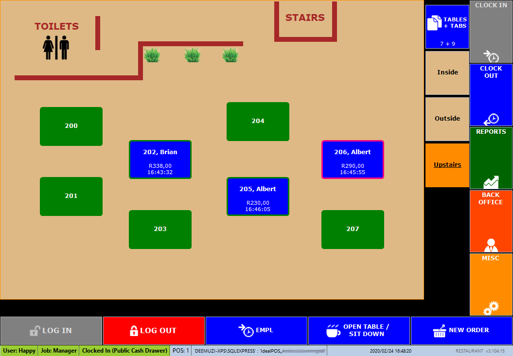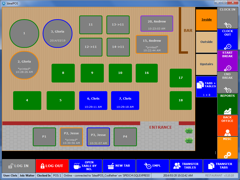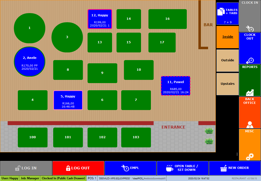 - unlimited number of floors - move tables and tabs - transfer items between orders - transfer orders between users - merge tables - waiter areas - monitor Bar and Table Services - high performance