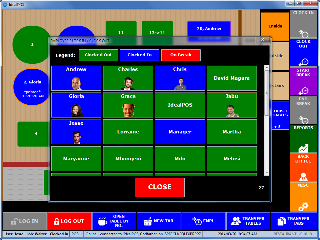 - clock in / out (start / end shift) - breaks - different user jobs (waiter, bar, driver ...) - password protected clocking in and out